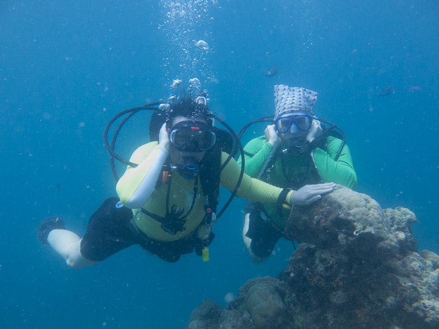 Carol and Rod showing the best method to escape the cleaning wrass while waiting for the manta.