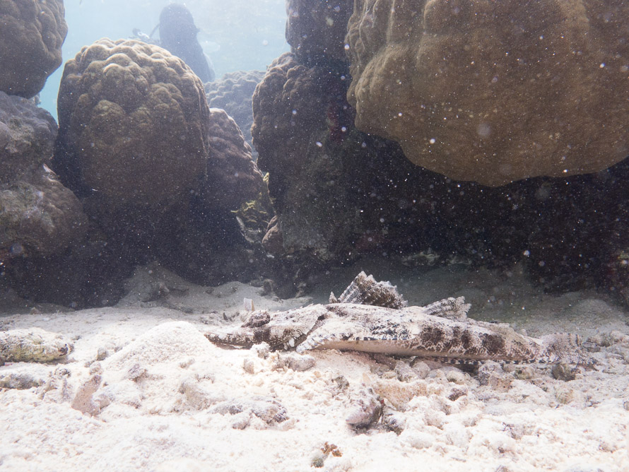 Crazy crocodile fish laying in wait on the bottom of the coral boulders.