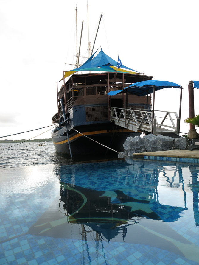 The restaurant and bar of the hotel with the pool in the foreground.